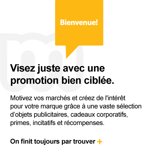 Motivez vos marchés et créez de l'intérêt pour votre marque grâce à une vaste sélection, d’objets publicitaires, cadeaux corporatifs, primes, incitatifs et récompenses. On finit toujours par trouver +
